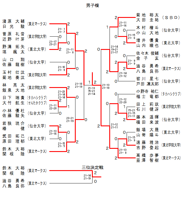 | MD-5 | 東北マークス | 澁谷 勇希・八島 良弥 | 2 | 21- 9 21- 9 | 0 | 佐々木 俊輔・金子 玄 | 仙台大 | |