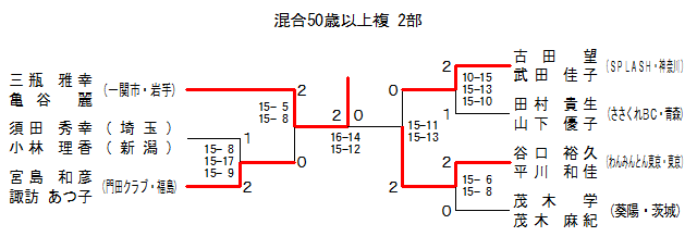 50X2-4 | 一関市・岩手 | 三瓶 雅幸・亀谷 麗 | 2 | 15- 5 15- 8 | 0 | 宮島 和彦・諏訪 あつ子 | 門田C.・福島 | |