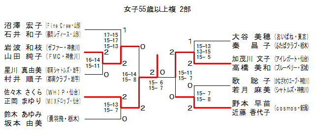 55W2-7 | アイレガート・仙台・ブルーベリー・宮城 | 加茂川 文子・高橋 美和 | 2 | 15-11 15- 7 | 0 | 野本 早苗・近藤 香代子 | cosmos・新潟 | |