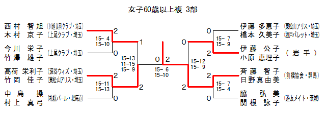 60W3-6 | ‘O‹´‹¦‰ïEŒQ”n | Ä“¡ ’qŽqE“ú–ì^—R”ü | ‚Q | 15-12 15- 9 | ‚O | ˆÉ“¡ ŒöŽqE¬Œ´ Œb—Žq | ŠâŽè | |