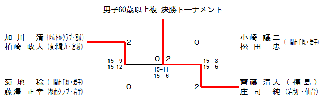 M60-1 | せんたかC.・宮城・東北電力・宮城 | 加川 清・柏崎 政人 | 2 | 15- 9 15-12 | 0 | 菊地 稔・藤澤 正幸 | 一関市千厩・岩手・都南C.・岩手 | |