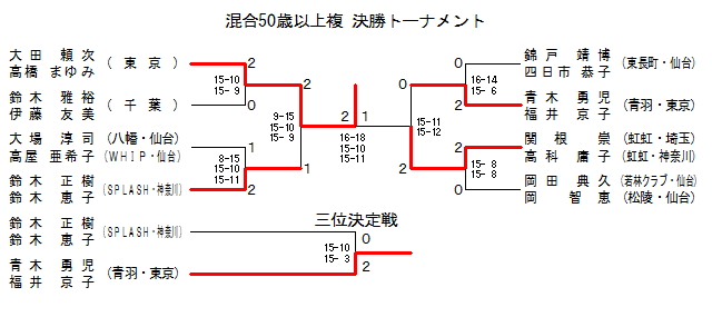 X50-2 | SPLASH・神奈川 | 鈴木 正樹・鈴木 恵子 | 2 | 8-15 15-10 15-11 | 1 | 大場 淳司・高屋 亜希子 | 八幡・仙台・WHIP・仙台 | |