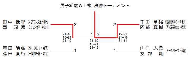 M35-2 | 宮城高専OB・神奈川・宮城高専OB・栃木 | 千田 章裕・阿部 真樹 | 2 | 15-21 21- 8 21-11 | 1 | 山口 大貴・友部 翔 | ノースリーブ・茨城 | |