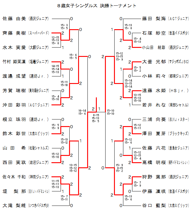 | 佐藤 愛莉 (鮭川バドスポ少) | × 13-15 3-15 | × 8-15 3-15 | 3 | |