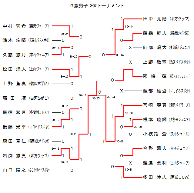 | 9B3-11 | 北方C. | 岩渕 悠真 | 1 | 30-10 | 0 | 山口 陽之 | ふじかげバドスポ少 | |
