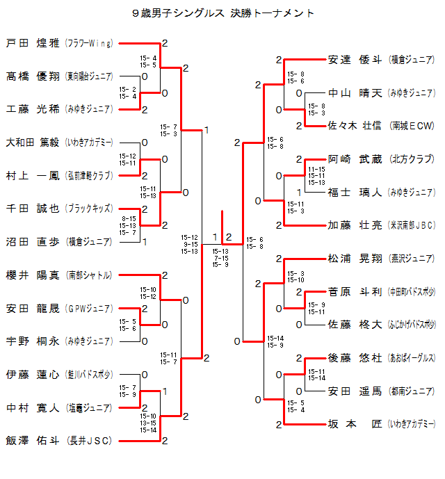 | 9B-15 | 米沢南部JBC | 加藤 壮亮 | 2 | 15-11 15- 3 | 0 | 阿崎 武蔵 | 北方C. | |
