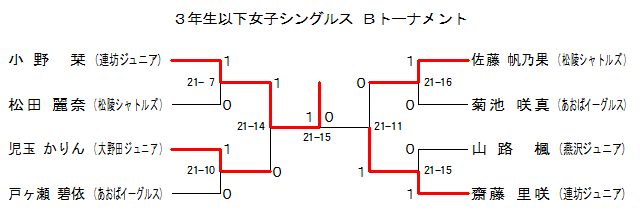 | 3GS2-1 | 連坊Jr. | 小野 栞 | 1 | 21- 7 | 0 | 松田 麗奈 | 松陵シャトルズ | |