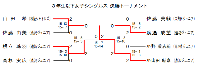 | 小山田 結彩 (燕沢ジュニア) | ○ 15- 6 15- 6 | ○ 15-10 15- 2 | 1 | |